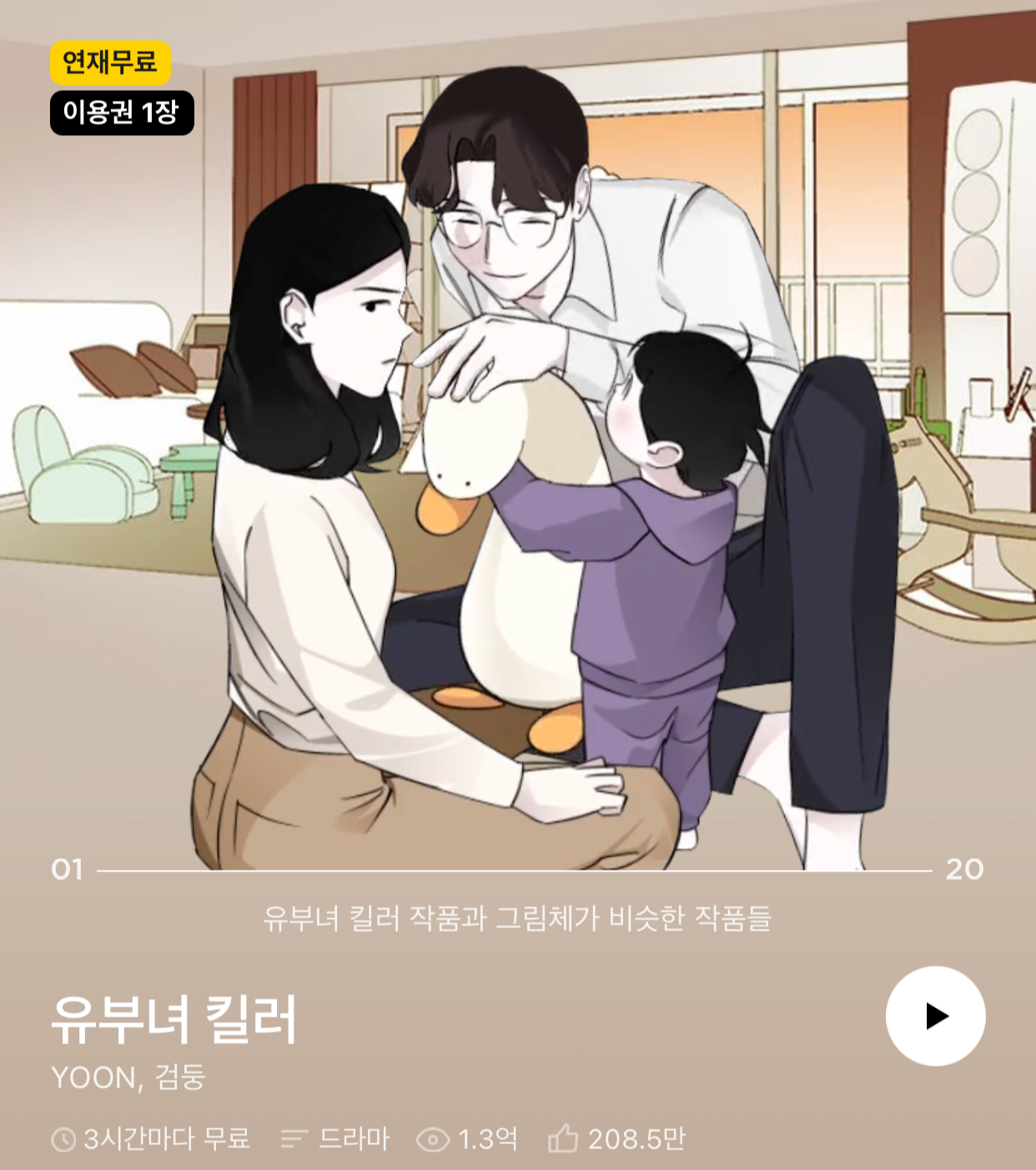 최근 시즌3로 돌아온 <유부녀 킬러>도 워낙 유명한 작품. 지금 3시간 무료 프로모션 적용 주이니 정주행 기회다! 평범한 유부녀처럼 살아가지만 실상은 최고 실력의 킬러로, 사회의 해가 되는 사람들을 처리하고 다니면서 속시원함을 안겨주는 웹툰이다.